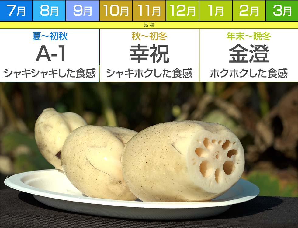 れんこんには「冬が旬」というイメージがある。しかし実際は、品種ごとに初夏から春先まで幅広い表情を見せる。宮本さんの畑では「A-1(エーワン)」「幸祝(こうしゅく)」「金澄(かなすみ)」の三品種を栽培。それぞれの旬を見極め、最もおいしいタイミングで出荷している。