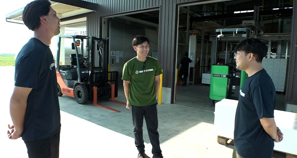 1枚目:新海さん(生産部門・入社10年目) 2枚目:鷹橋さん(出荷部門・入社6年目)
