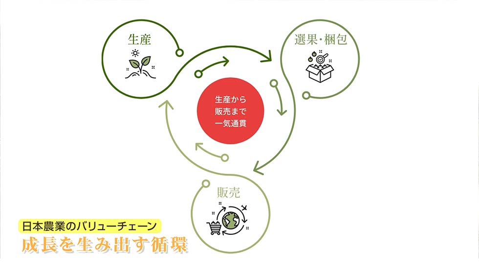 内藤さんが描く「成長のサイクル」は、りんごで実装された「海外需要を起点に、生産・選果・製品化/販売を組み替えるモデル」を、他の作物にも横展開していくという発想だ。